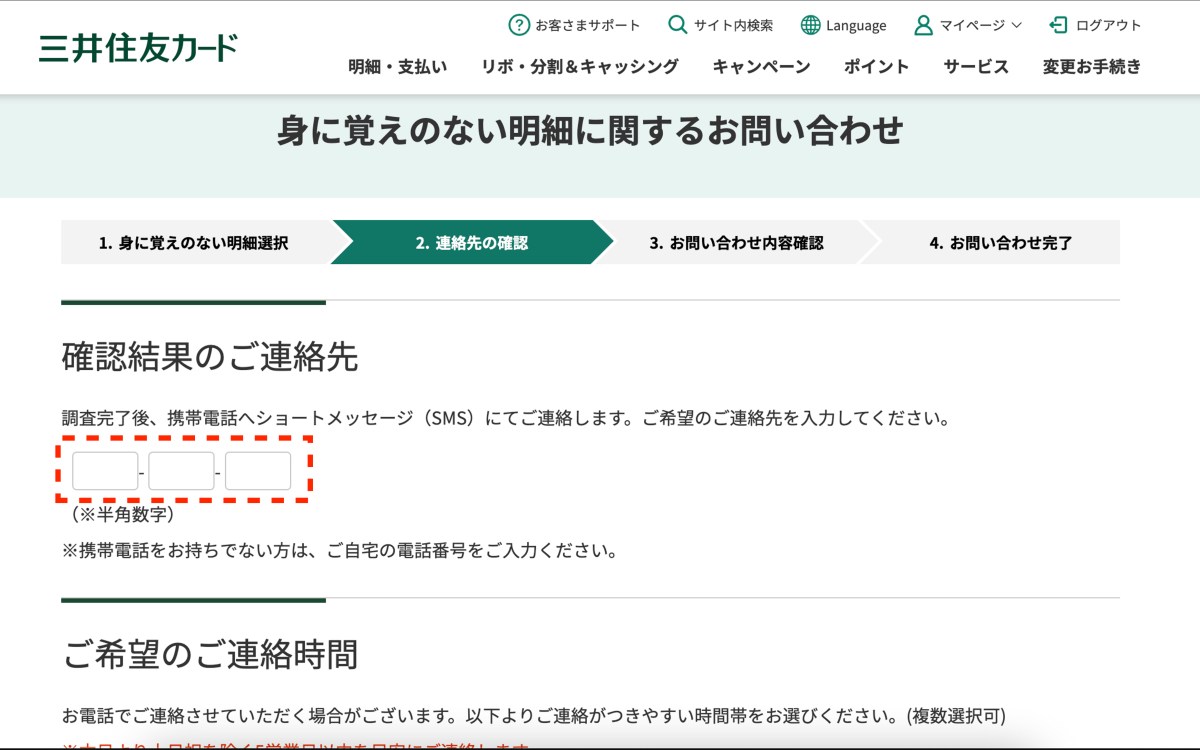 次のページへ行くと、確認結果のご連絡先という項目があるので、そこに携帯電話番号を入力し、次へ行く。